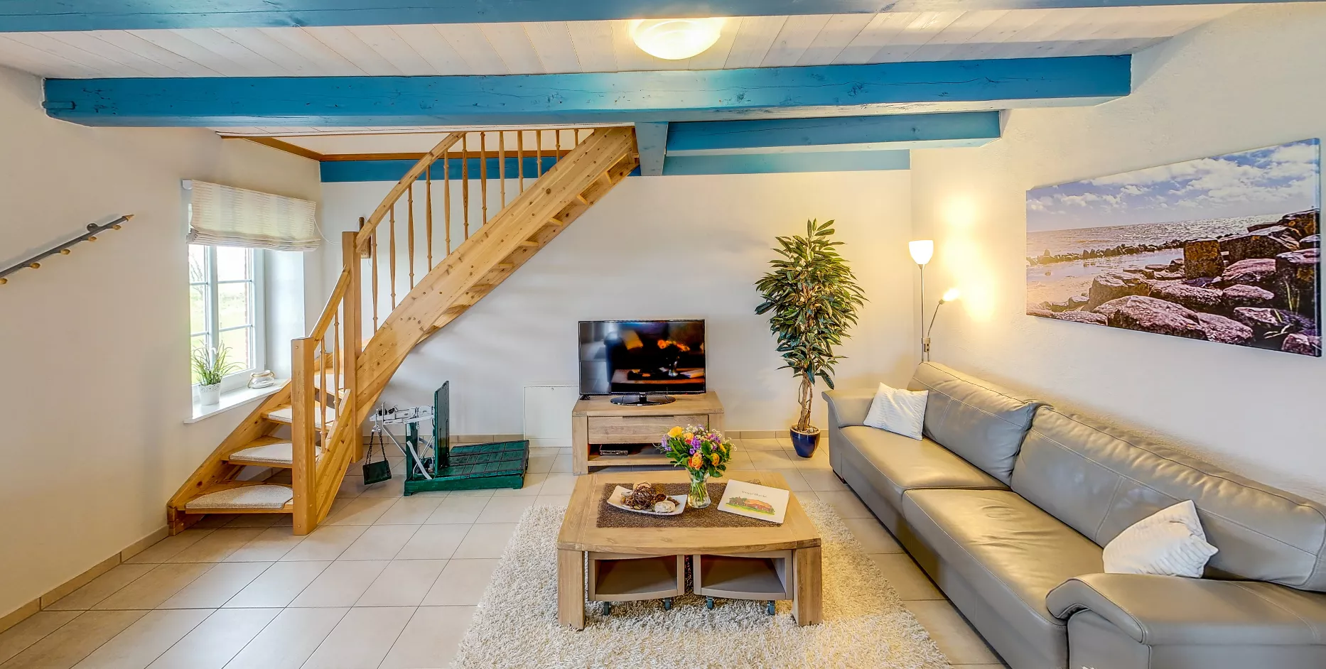 In dieser Ferienwohnung können Sie den herrlichen Blick über die Wiesen und Felder bis zum Deich der Insel Pellworm genießen. Im Erdgeschoß befindet sich das moderne Wohn- und Esszimmer sowie ein Gäste WC. Die Wohnung verfügt über eine neue und modern voll ausgestattete Küche. Im Obergeschoss das modern und luxuriös ausgestattete Bad mit einer freistehenden Badewanne, einer großen Dusche, ein extra WC Raum. Das Schlafzimmer mit einem großen Rundbett. Es ist ausreichend Platz für 2 Personen, auf 90 m². Bei Bedarf stellen wir gerne zusätzlich für Kinder ein Baby-/Beistellbett zur Verfügung. Mit viel Liebe zum Detail ist die Ferienwohnung modern und schick eingerichtet. Besonders geeignet ist die Wohnung auch als Hochzeits-Appartement. Das gesamte Haus ist mit Fußbodenheizung ausgestattet.